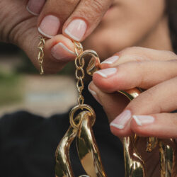 La pieza está terminada en un baño dorado de alta calidad, con superficies suaves y curvas que evocan fuerza y fluidez. Incorpora un cierre ajustable que permite adaptar la longitud de uso, garantizando comodidad y versatilidad en distintas ocasiones.