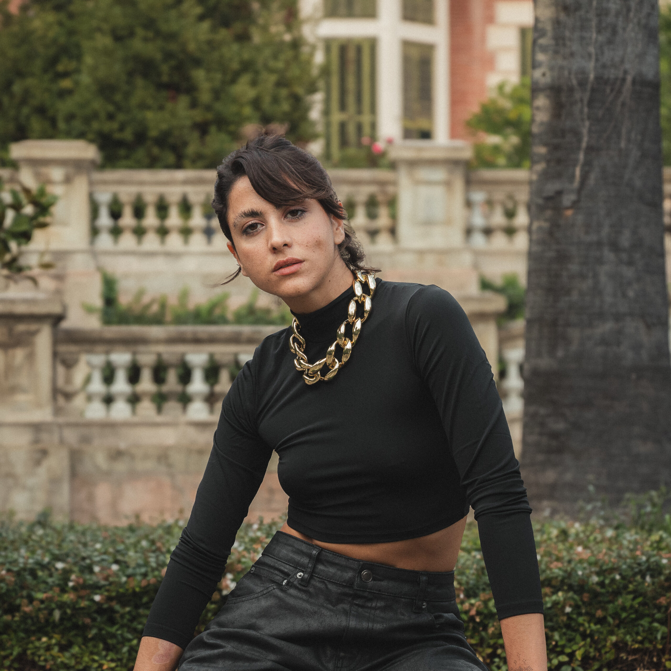 Este collar representa una declaración visual poderosa: ideal para elevar conjuntos minimalistas y acompañar atuendos de noche con un toque de lujo moderno.