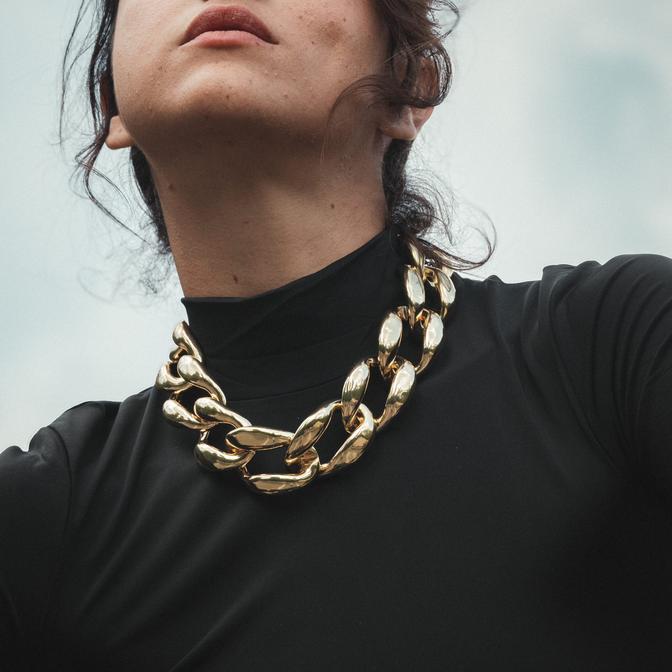 Un collar de cadena gruesa con eslabones orgánicos y pulido espejo que refleja la luz con una intensidad sofisticada. Su diseño imponente y contemporáneo aporta carácter a cualquier look, convirtiéndose en el punto focal del estilismo.