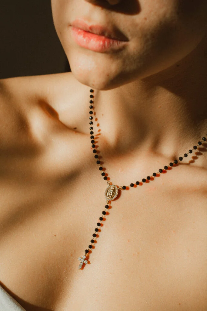 Diseñado para destacar, este collar estilo rosario redefine el concepto de elegancia urbana. Las cuentas negras facetadas aportan textura y profundidad visual, mientras los acentos dorados —incluyendo una medalla central con relieve y una cruz con cristales— funcionan como puntos focales brillantes que capturan la luz con cada movimiento.