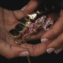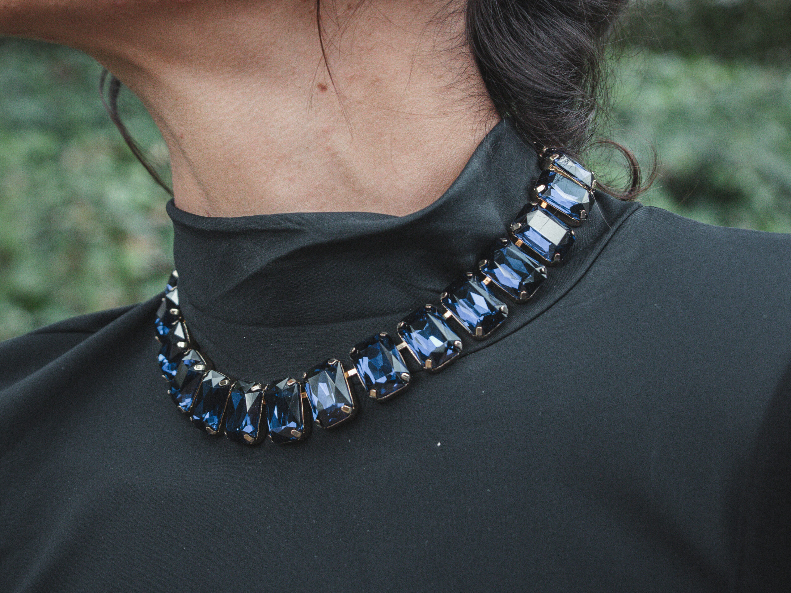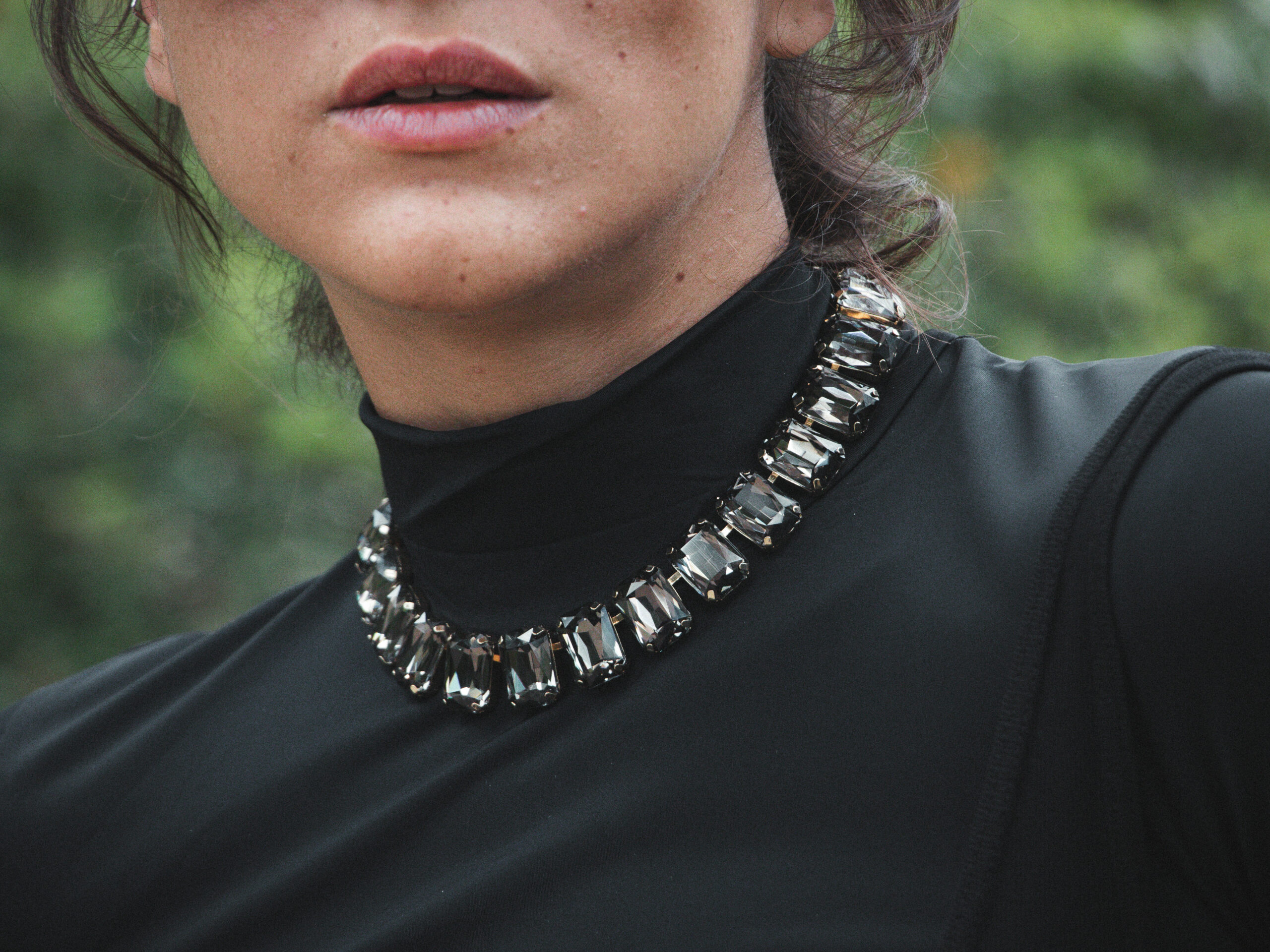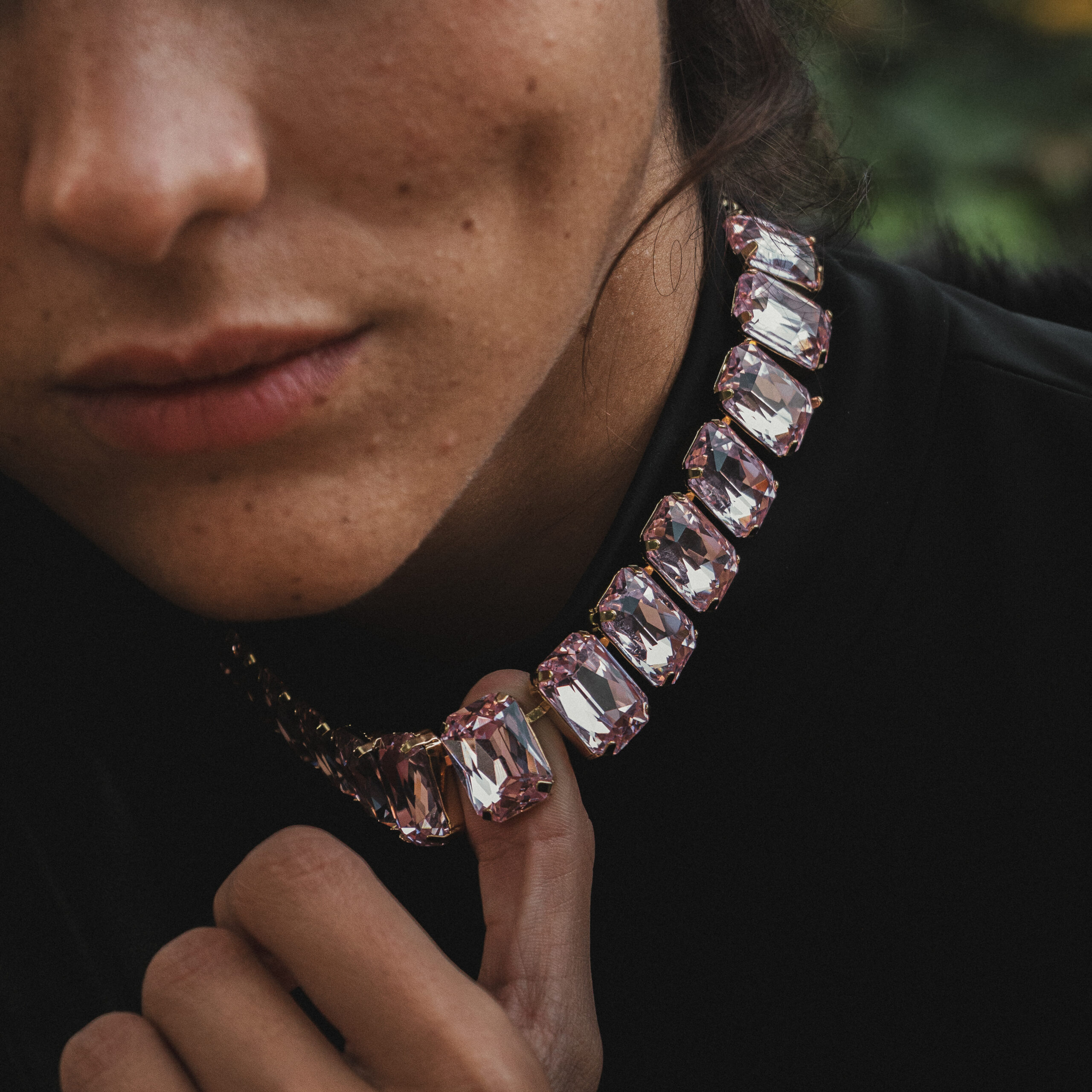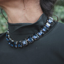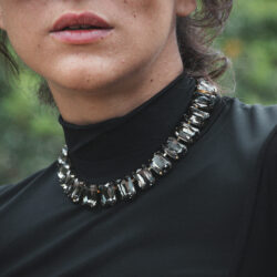 Su diseño estructurado y equilibrado evoca una sofisticación atemporal, con un aire de lujo contemporáneo y fuerza visual. Cada piedra refleja la luz con un resplandor elegante, generando un efecto hipnótico que realza el porte y la elegancia del cuello.