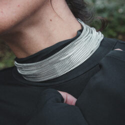 Diseño flexible, fluido y contemporáneo. Su estructura se compone de cadenas planas entrelazadas que crean una textura uniforme y metálica, envolviendo el cuello con un efecto de segunda piel.